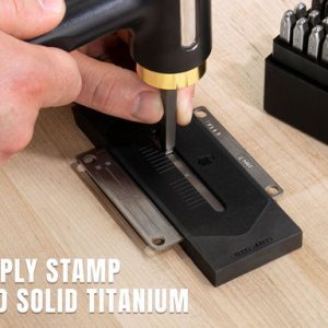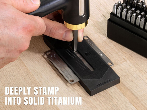 - Šablona za žigosanje je orodje, ki titanovo ploščo drži na mestu in poskrbi za popolno razporeditev. Ima indikatorje za lažje nastavljanje črk in številk. Šablona se namesti na nakovalo, ki je na spodnji strani prevlečeno z gumo za absorpcijo udarcev.