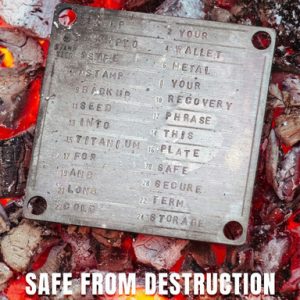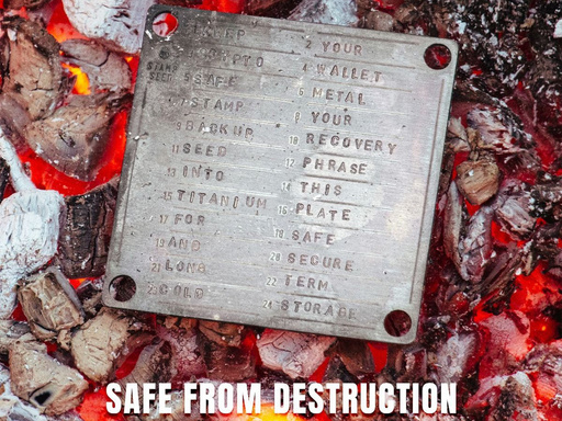 Komplet je primeren za shranjevanje varnostne kopije kripto denarnic ali drugih gesel. Titanova plošča je odporna na visoke temperature do 1650°C, požare, udarce, vodo in korozijo. Za izdelavo varnostne kopije uporabite komplet za žigosanje, nakovalo s šablono ter lastno kladivo.